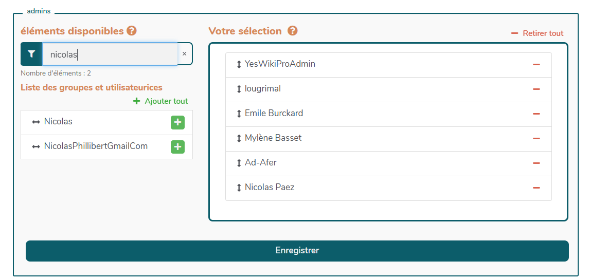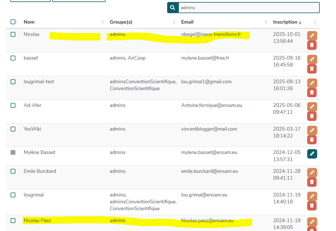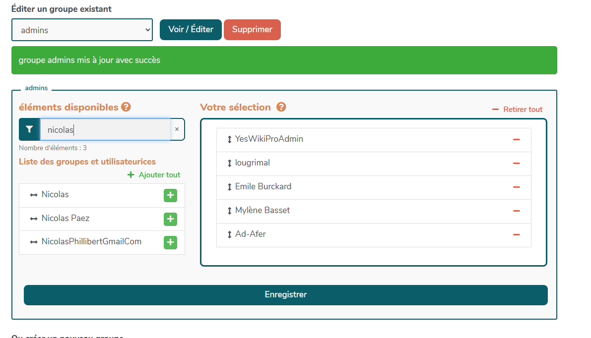 Nicolas Paez a bien été ajouté au groupe admins, mais un autre Nicolas a également été ajouté :
