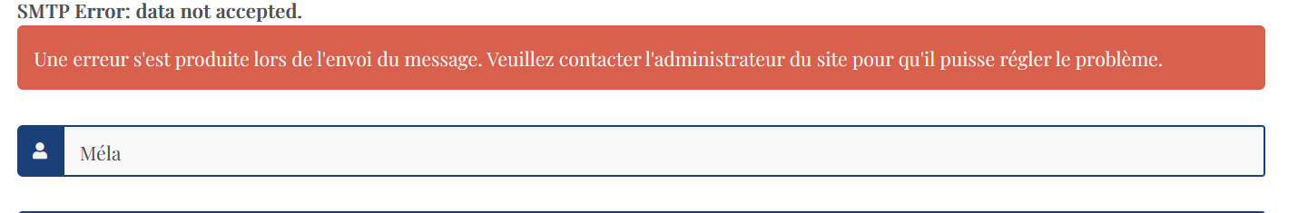 Par contrer si j’utilise l’action {{contact …}} (formulaire de contact), le mail ne part pas, et j’ai un message d’erreur « SMTP Error Data not accepted »