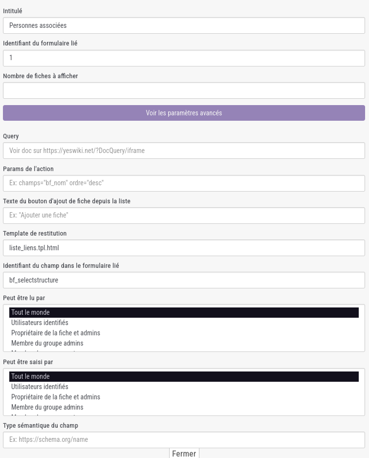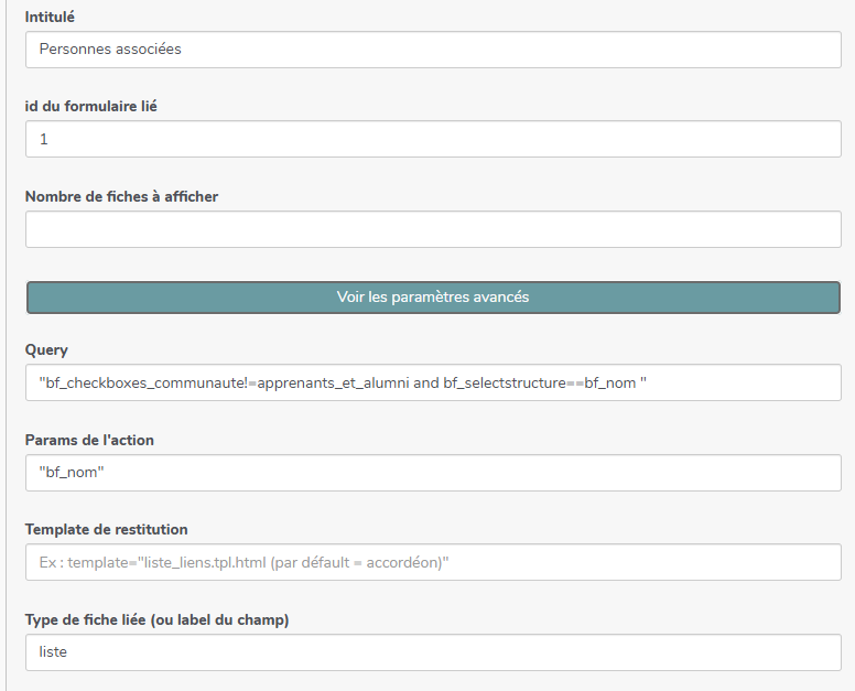 Dans Structure je veux afficher la liste des Personnes liées, j’utilise un champ « Liste des fiches liées ».