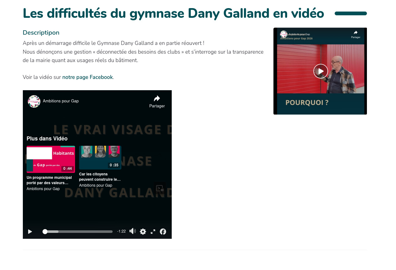 Le code est bien sur cette page, mais rien ne s’affiche : Ambitions pour Gap 2026 : Les difficultés du gymnase Dany Galland en vidéo