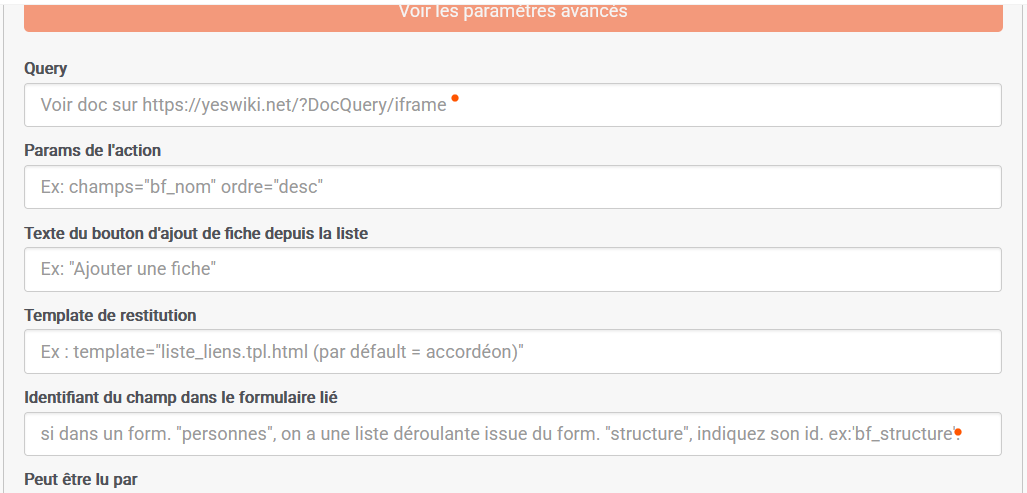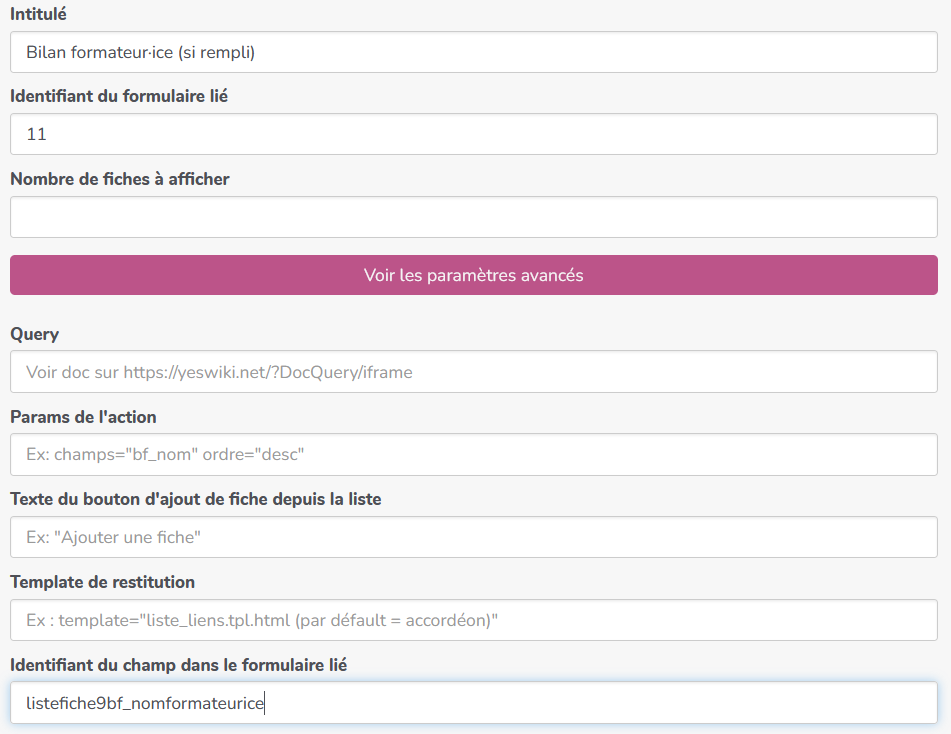 Par ailleurs si je regarde la documentation il est écrit : " Type de fiche liée (ou label du champ) Vous devez préciser ici le type de champ utilisé dans le formulaire lié pour effectuer cette liaison. « liste » pour une liste déroulante. « checkbox » pour un groupe de cases à cocher. « radio » pour un groupe de boutons radio."